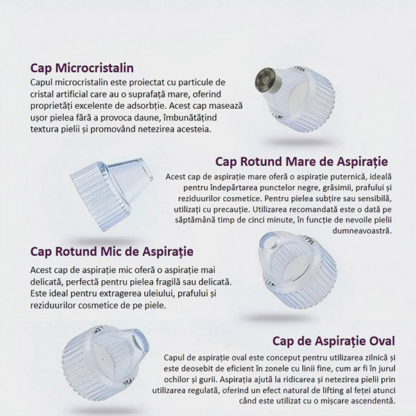 Dispozitivul vine cu 4 atașamente interschimbabile, fiecare conceput pentru a viza preocupări specifice ale pielii. Consultați graficul de mai jos pentru mai multe detalii despre modul în care funcționează fiecare atașament!